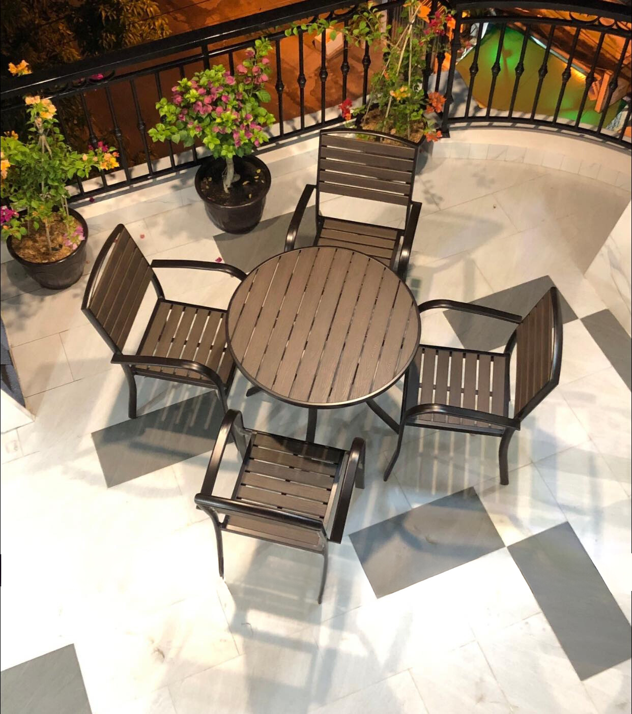 - Chất liệu bền bỉ, chống chịu thời tiết: Khung hợp kim nhôm đúc sơn tĩnh điện và nan gỗ nhựa polywood đảm bảo độ bền lâu dài.