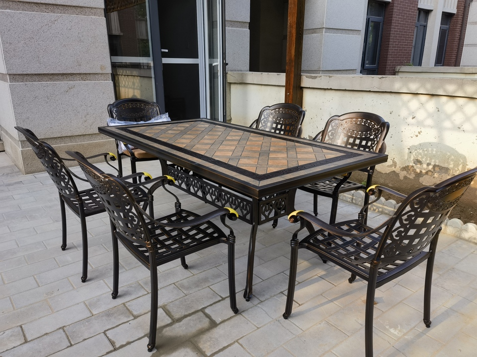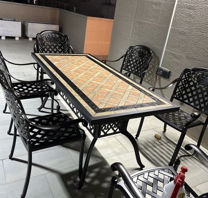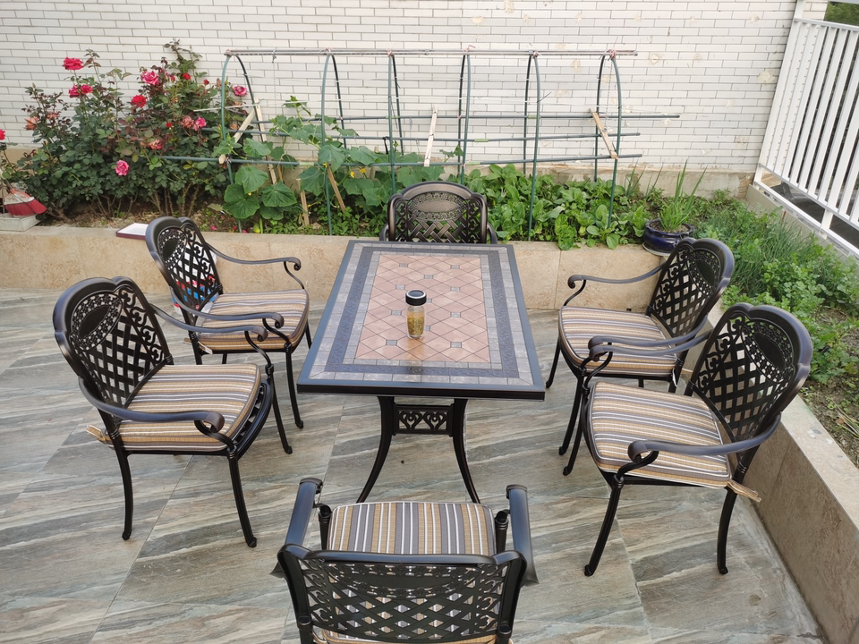 Bộ bàn ghế sân vườn nhôm đúc được làm bằng chất liệu nhôm đúc mặt lát gạch cao cấp khung bàn và ghế được phủ thêm hai lớp sơn tĩnh điện cao cấp. Chất liệu này không chỉ cứng cáp mà còn có khả năng kháng nước, kháng gỉ và hạn chế tối đa các tác động từ môi trường. Bạn có thể đặt bộ bàn ghế nhôm đúc nghệ thuật làm bàn ăn/bàn trà tại khu vực sân vườn/ban công mà không phải lo sợ thời tiết bào mòn.