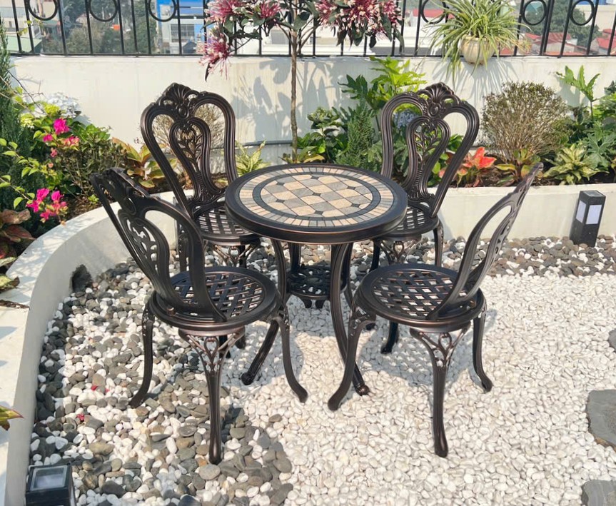 Bộ sản phẩm bao gồm 1 bàn tròn với đường kính là 60cm + 4 ghế vương niệm. Khung bàn được làm bằng hợp kim nhôm phủ thêm một lớp sơn tĩnh điện cao cấp, mặt bàn được làm bằng đá gốm, hai chất liệu này kết hợp với nhau làm lên một sản phẩm hài hòa với 2 màu sắc của mặt bàn đá là karo xanh và hoa vàng.
