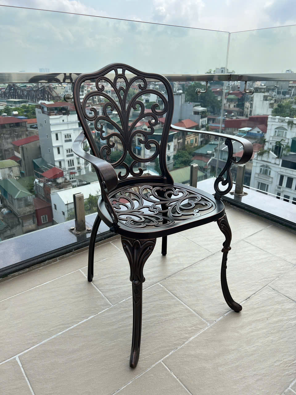 Kết hợp với mẫu bàn này là những chiếc ghế có chiều sâu cùng kích thước và những đường cong tạo cảm giác cho người ngồi cảm thấy thoải mãi cho người ngồi. ngoài ra bộ bàn ghế ngoài trời nhôm đúc này còn gây ấn tượng nổi bật bởi hoa văn mặt bàn in nổi nhìn lạ mắt và sang trọng, sản phẩm này là một lựa chọn hoàn hỏa cho không gian sân vườn nhà bạn.