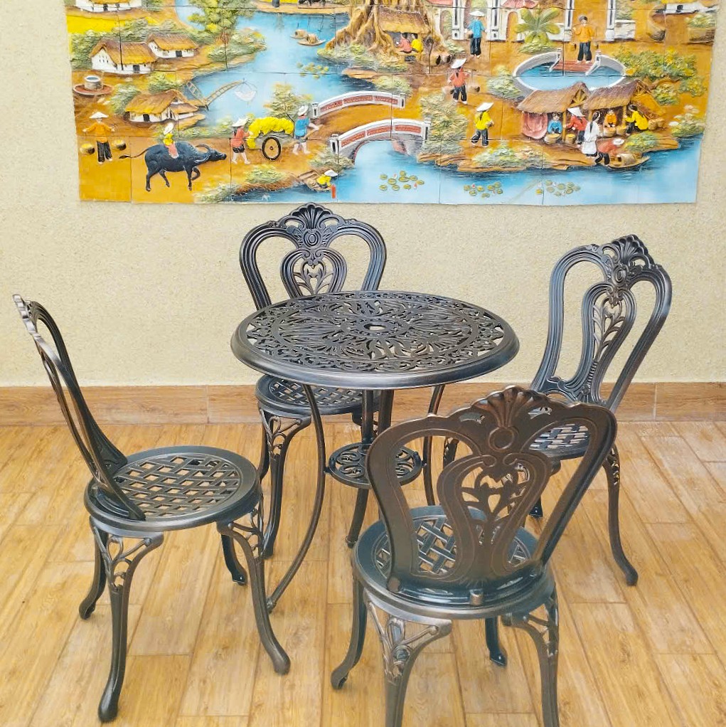 Bộ bàn ghế sân vườn D68-4G màu đồng là mẫu bàn ghế đang được bán chạy nhất hiện nay, vì nó sử dụng chất liệu nhôm đúc cao cấp và nhập khẩu 100%, đây là chất liệu được nhiều người tiêu dùng lựa chọn sử dụng. Bởi vì sản phẩm này còn được phủ thêm một lớp sơn tĩnh điện cao cấp nữa giúp nó chống oxy hóa không bị han gỉ khi để ở ngoài trời làm bàn tiếp khách sân vườn hay bàn café ban công rất sang trọng.
