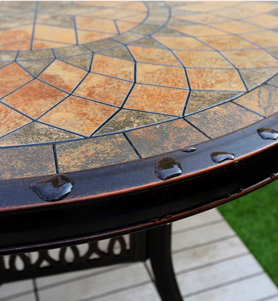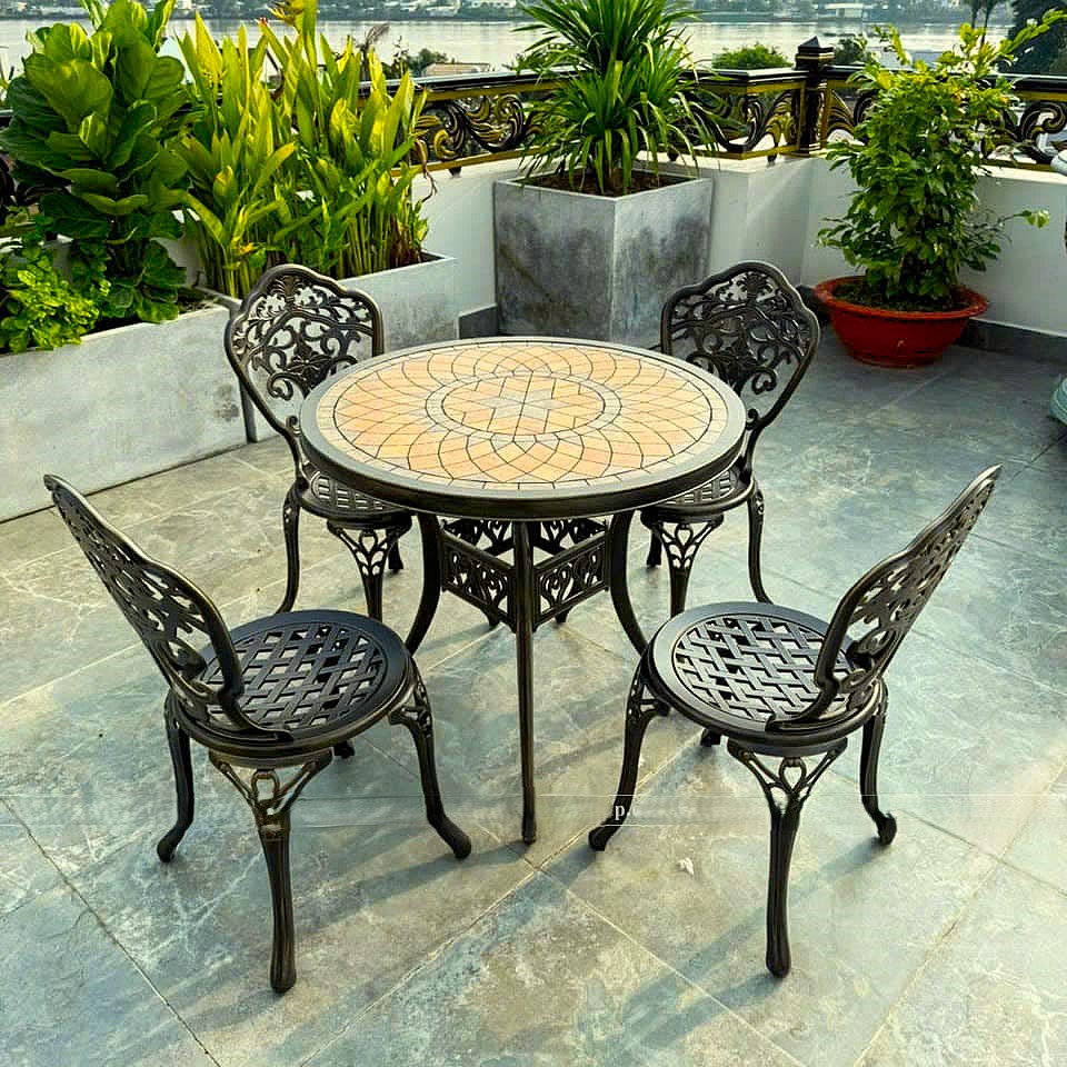 Khung bàn và ghế được chế tạo từ nhôm đúc phủ sơn tĩnh điện – chất liệu nổi bật với khả năng chống oxy hóa, chống ăn mòn và không bị gỉ sét, kể cả khi đặt ngoài trời mưa nắng lâu dài. Đặc biệt, nhôm đúc có trọng lượng nhẹ hơn sắt thép, giúp bạn dễ dàng di chuyển, sắp xếp lại vị trí mà không gây trầy xước nền gạch hoặc gỗ.