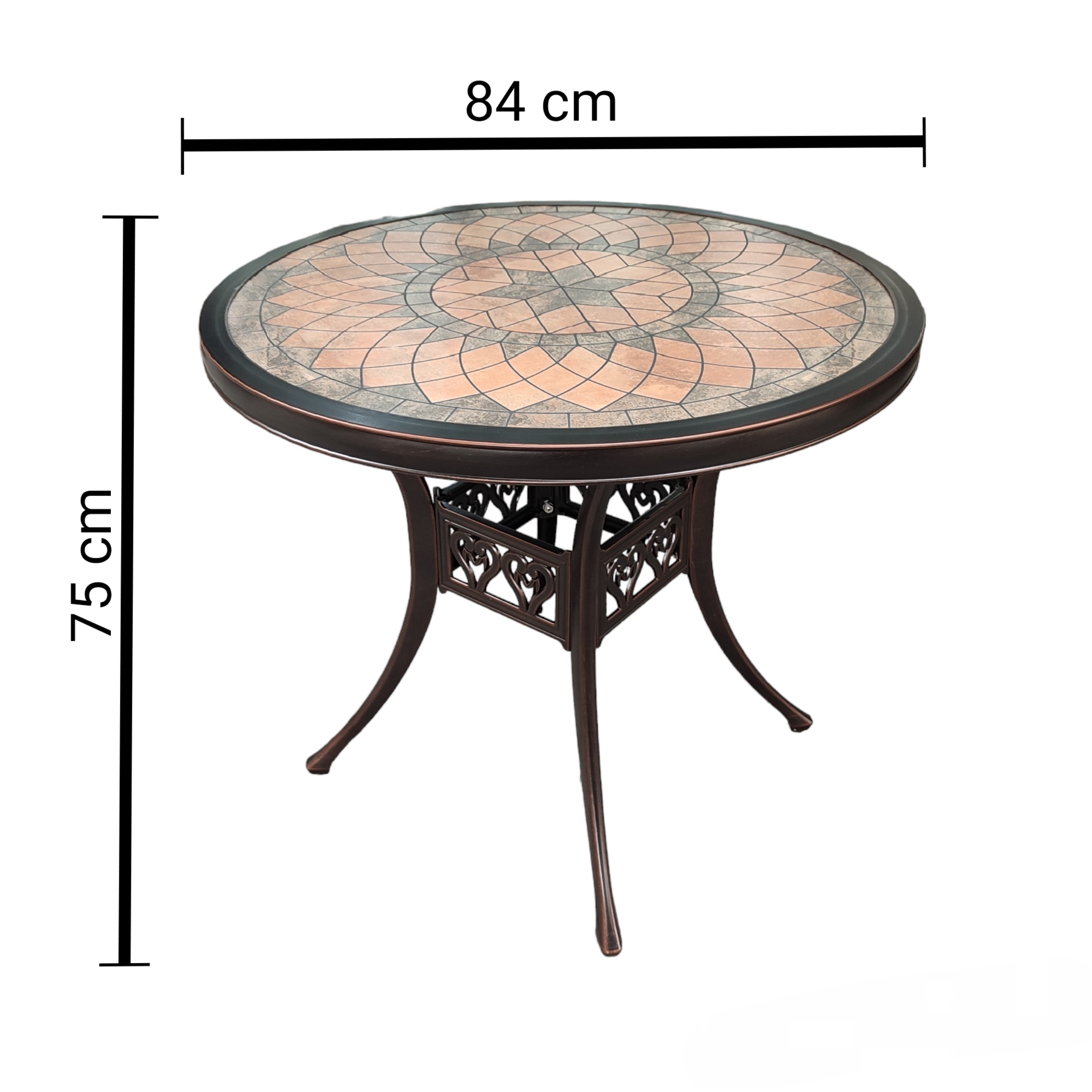 Bộ sản phẩm nổi bật với bàn tròn đường kính 84cm, kích thước lý tưởng cho các buổi thưởng trà, dùng bữa sáng hay trò chuyện nhẹ nhàng cùng gia đình, bạn bè. Thiết kế mặt bàn tròn giúp tạo sự gần gũi, kết nối giữa các thành viên, trong khi các họa tiết viền và chân bàn được đúc tinh xảo mang lại vẻ đẹp nghệ thuật cổ điển, phù hợp với nhiều phong cách kiến trúc từ hiện đại đến tân cổ điển.