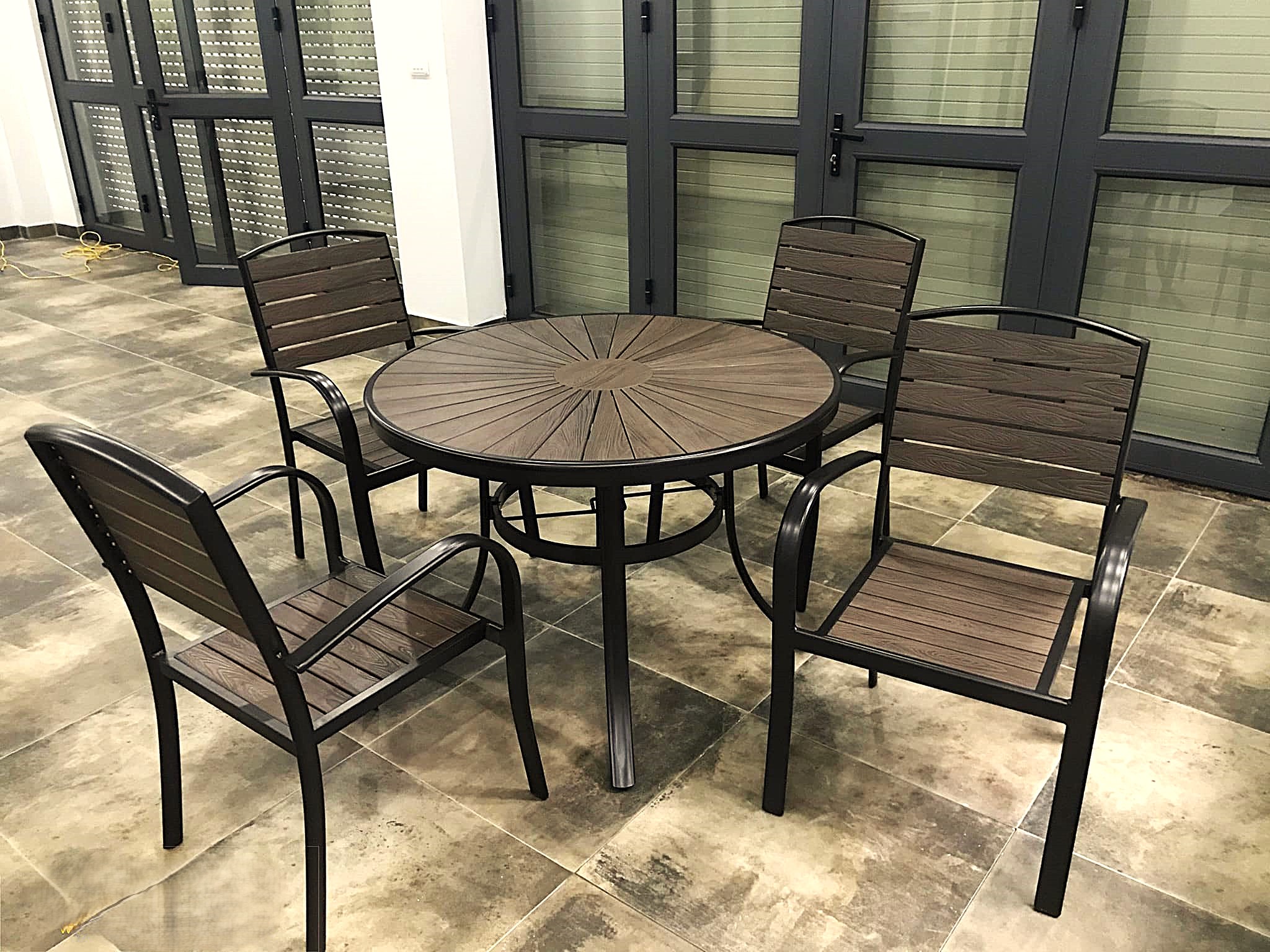 Mặt bàn được thiết kế từ nan gỗ nhựa composite – loại chất liệu chuyên dụng cho không gian ngoài trời. Với khả năng chống chịu nắng mưa mà không bị han gỉ, gãy mục như nhiều chất liệu khác, gỗ nhựa composite đảm bảo cho sản phẩm sự bền bỉ và tuổi thọ cao. Ngoài ra, công nghệ sơn tĩnh điện cao cấp giúp tạo nên lớp phủ sáng bóng, bền màu, và có khả năng chống oxy hóa, ngăn chặn bong tróc trong quá trình sử dụng.