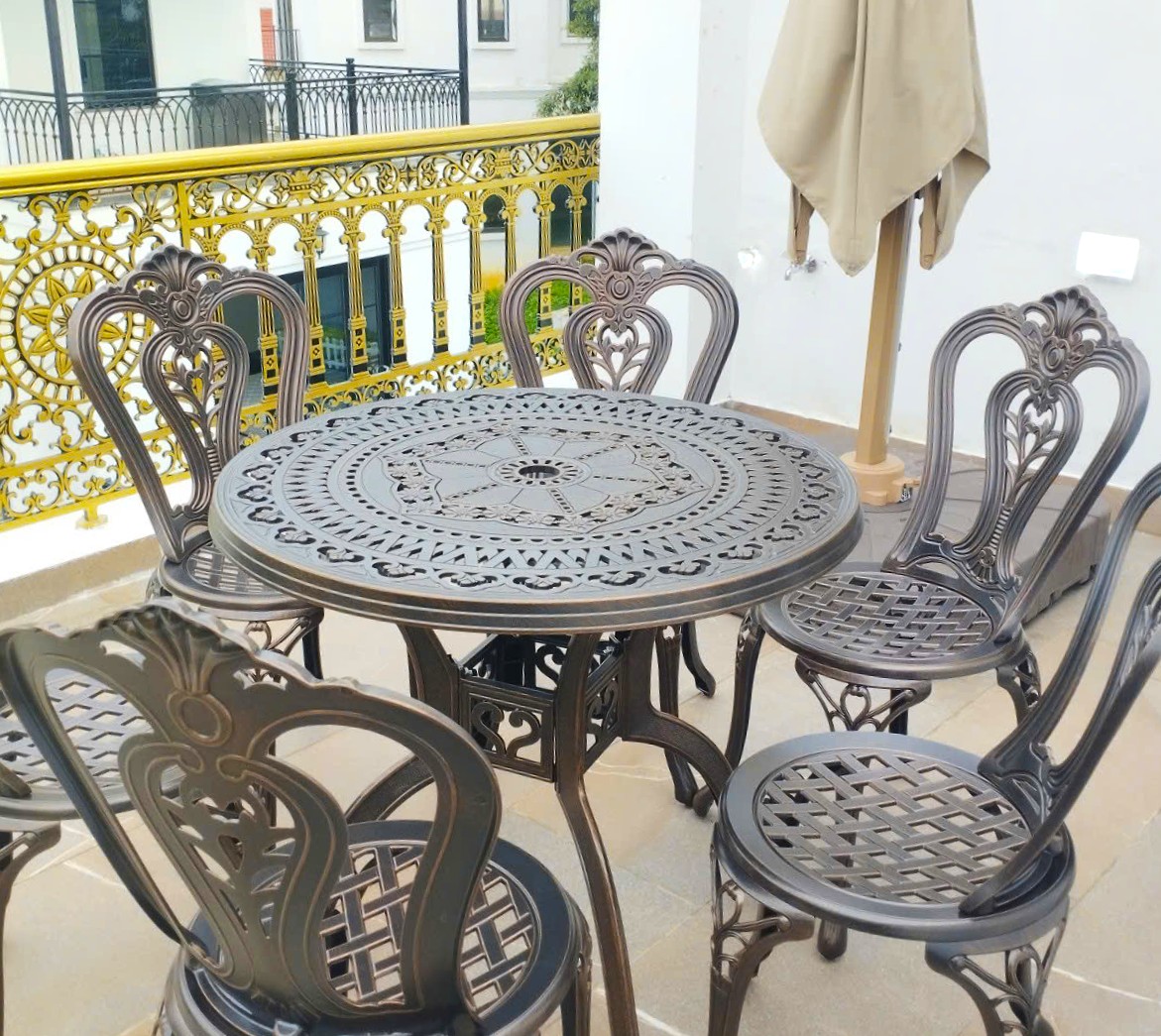 Bộ bàn ghế sân vườn ngoài trời bằng nhôm đúc gồm 1 bàn tròn và 6 ghế, thiết kế theo phong cách tân cổ điển, mang đến vẻ đẹp sang trọng và đẳng cấp cho không gian ngoại thất. Chất liệu nhôm đúc nguyên khối phủ sơn tĩnh điện giúp sản phẩm bền bỉ, chống gỉ sét, phù hợp sử dụng lâu dài ở sân vườn, ban công, sảnh biệt thự, quán cà phê, hoặc resort cao cấp.