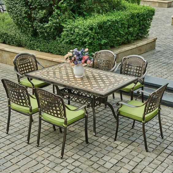 Bộ bàn ghế sân vườn nhôm đúc gồm bàn hợp kim nhôm mặt đá và 6 ghế ngồi, được làm bằng chất liệu nhôm đúc mặt lát gạch cao cấp khung bàn và ghế được phủ thêm hai lớp sơn tĩnh điện cao cấp. Chất liệu này không chỉ cứng cáp mà còn có khả năng kháng nước, kháng gỉ và hạn chế tối đa các tác động từ môi trường. Bạn có thể đặt bộ bàn ghế nhôm đúc nghệ thuật làm bàn ăn/bàn trà tại khu vực sân vườn, mà không phải lo sợ thời tiết bào mòn.
