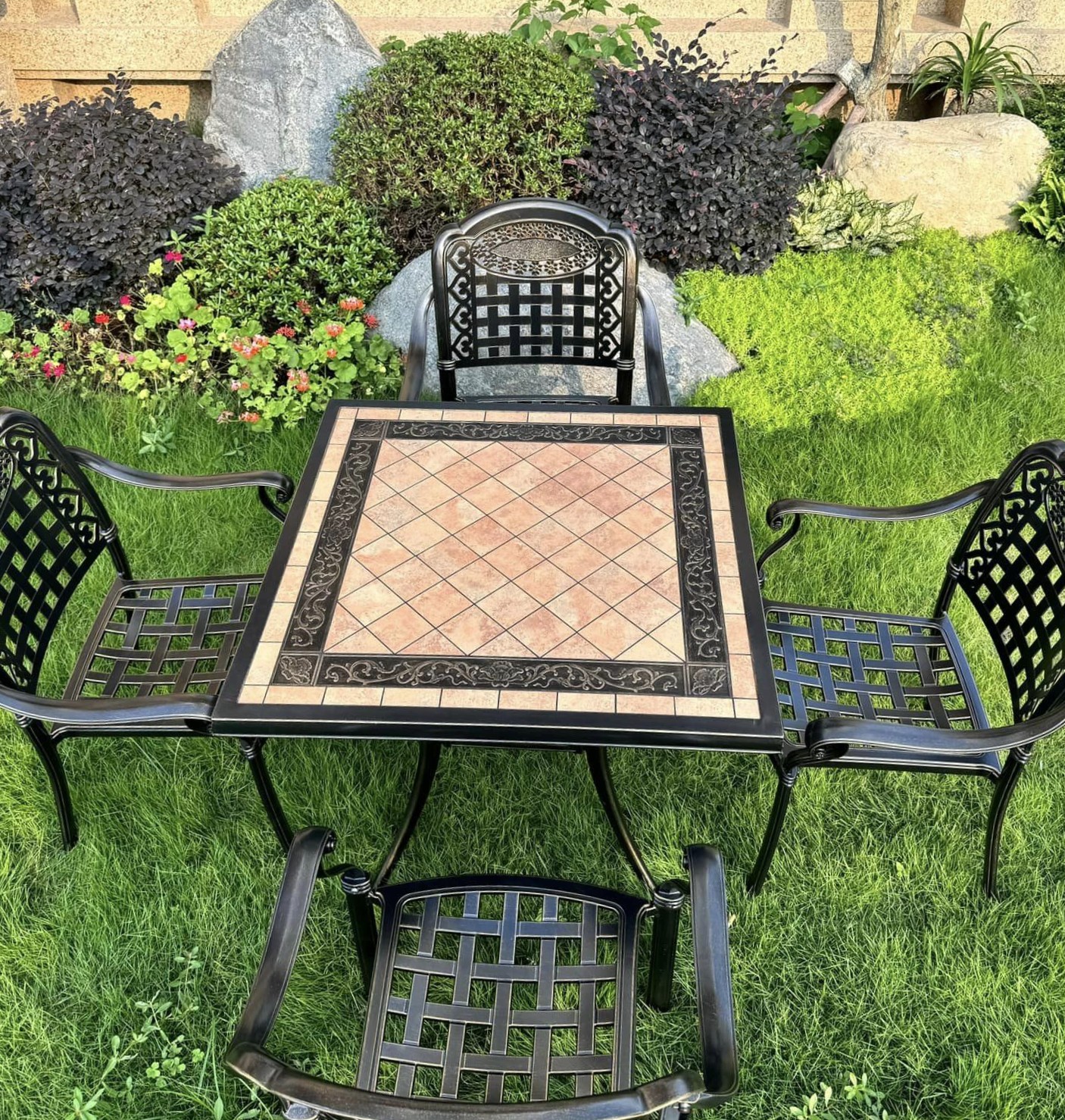 Điểm nhấn đặc biệt của bộ bàn ghế nằm ở mặt bàn đá gốm với họa tiết caro mắt, tạo nên tổng thể hài hòa và độc đáo. Các ô caro đan xen mang đến hiệu ứng thị giác sinh động, phù hợp với cả phong cách hiện đại tối giản lẫn vintage nhẹ nhàng. Dù đặt ở sân vườn, ban công, hiên nhà hay quán cà phê nhỏ, sản phẩm luôn nổi bật và thu hút mọi ánh nhìn.
